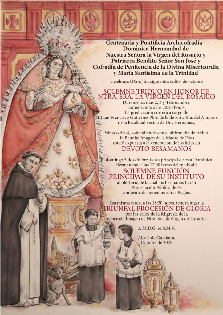 La Archicofradía Dominica de Nuestra Señora la Virgen del Rosario consagrará Solemnes cultos a su amantísima titular, los días 2, 3, 4 y 5 de octubre; celebrando Solemne Triduo, Besamanos y Procesión.
